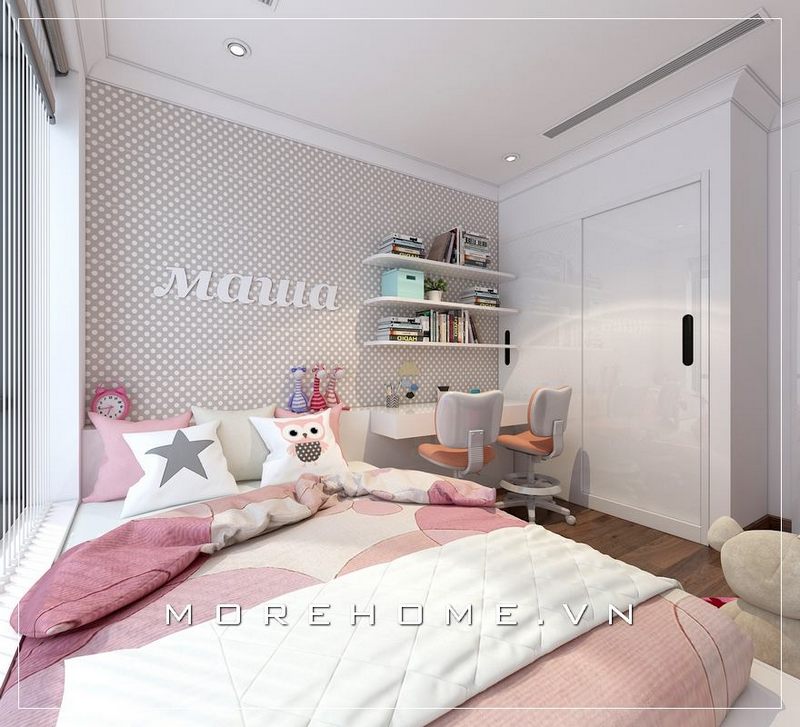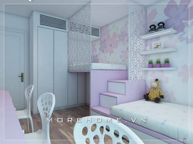 Tủ quần áo hiện đại liền kệ để đồ sẽ là gợi ý ấn tượng để phòng bé luôn được gọn gàng ngăn nắp.