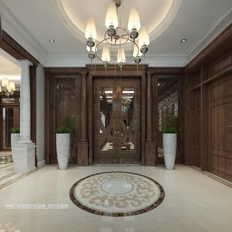 Thiết kế phòng khách biệt thự tân cổ điển đẹp, sang trọng với mẫu kệ decor gỗ óc chó tinh tế đẳng cấp