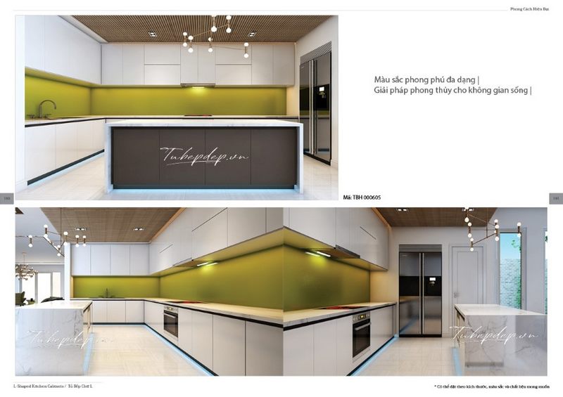 Tủ bếp acrylic trắng với kính ốp bếp xanh cốm tạo nên sự hoàn hảo. Các không gian bếp của biệt thự, nhà phố hoàn toàn có thể chọn mẫu thiết kế phòng bếp hiện đại trên đây bởi sự gọn gàng, trẻ trung lại rất sang trong mà nó mang lại.