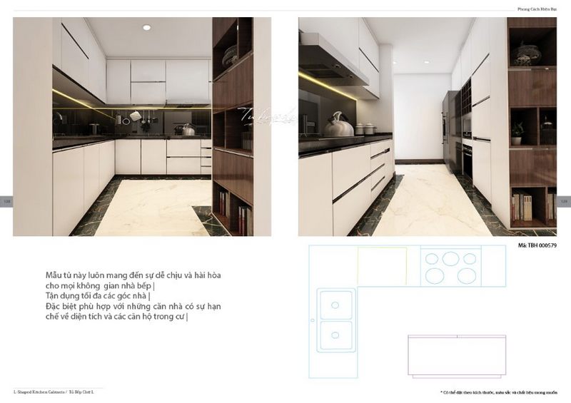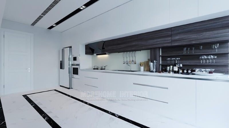 Mẫu thiết kế phòng bếp đặc biệt phù hợp với những căn nhà có diện tích không quá lớn khi bố trí hệ thống tủ bếp acrylic nhiều ngăn sáng tạo
