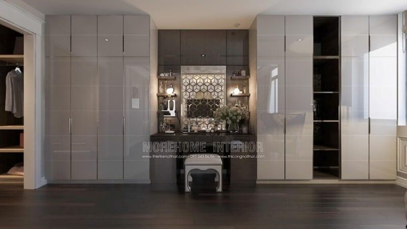 Sự kết hợp hài hòa giữa tủ quần áo gỗ Acrylic màu trắng hiện đại và khu vực trang điểm đẹp mắt và ấn tượng