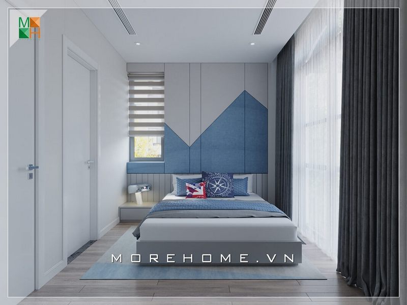 Giường ngủ thiết kế hiện đại, đơn giản, phần tab đầu giường liền mạch là nơi để được nhiều đồ dùng cá nhân của gia chủ hơn: đèn bàn, kính, sách báo...
