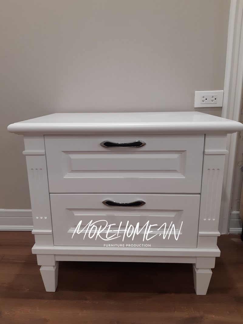 Tab đầu giường gỗ tự nhiên màu trắng tân cổ điển tạo điểm nhấn cho không gian, sử dụng tiện lợi và thẩm mỹ cao.