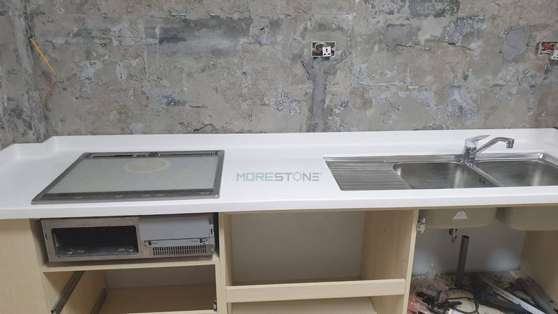 Mẫu thi công đá Himacs ốp bếp màu trắng sang trọng cho không gian bếp chung cư, nhà phố trở nên đẳng cấp hơn.