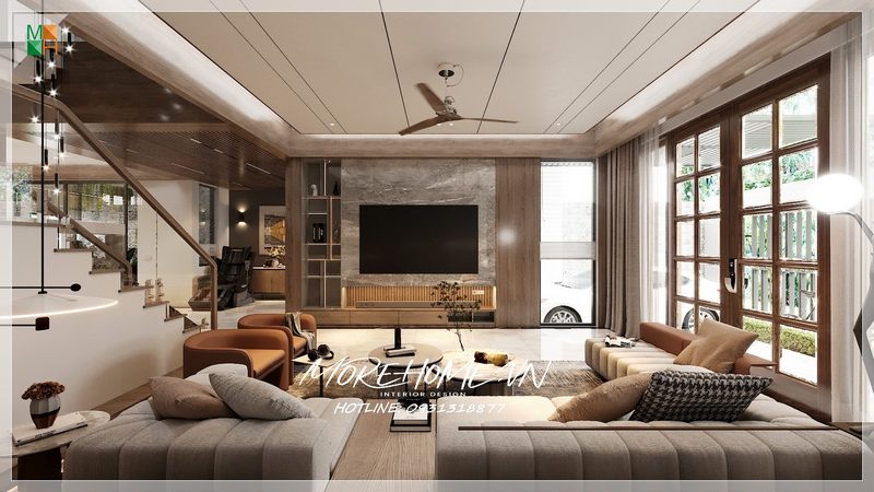 Bàn ghế sofa phòng khách có thiết kế hiện đại kết hợp với bàn trà tạo nên sự hài hòa trong không gian của căn phòng, gây ấn tượng rất tốt.